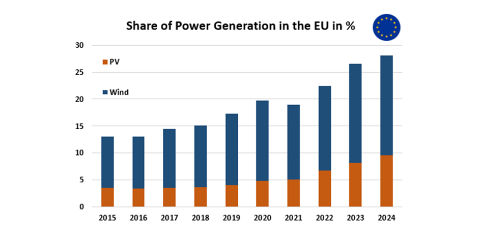 Graph: Development of Wind and PV as percentage of the generation mix in Europe (EU-27)