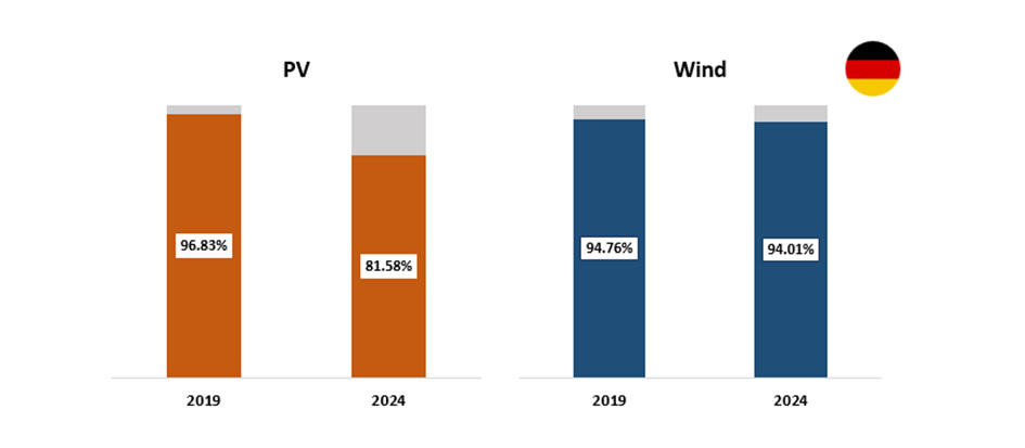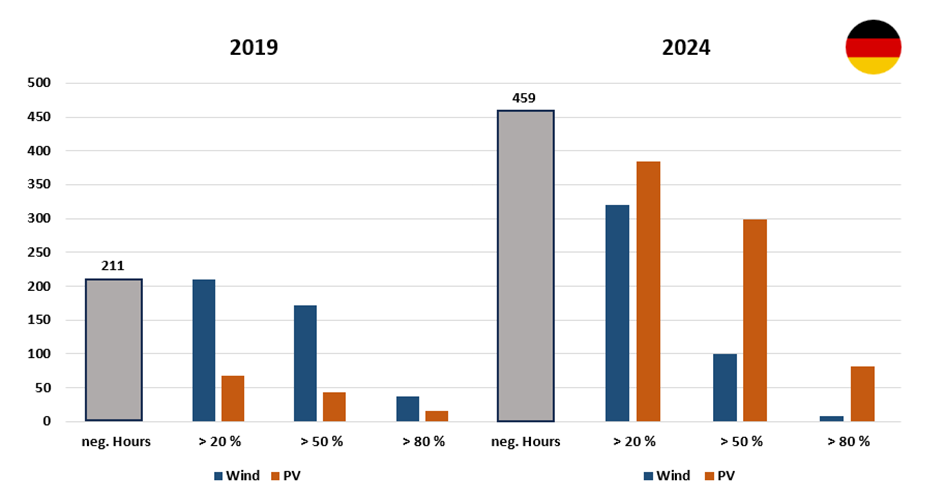 In Germany, for example, data show that negative prices frequently coincide with high renewable output. In 2019, wind played a more significant role, while by 2024, high midday solar output has become the main driver during negative pricing hours. This indicates that despite their technical capability to curtail, many renewable producers continue to inject power even when the market signals oversupply.