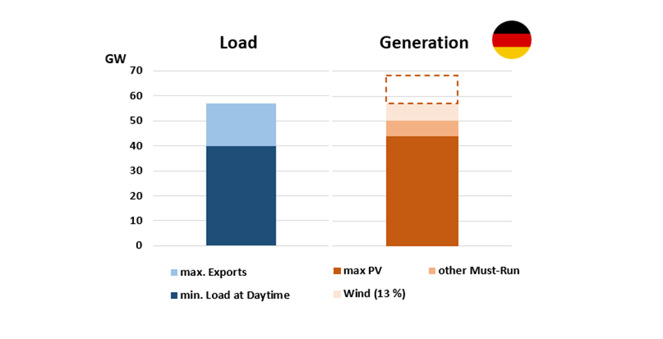 Graph: Comparison of load and generation in a theoretical scenario of oversupply due to high PV generation. Values for Germany, 2024.