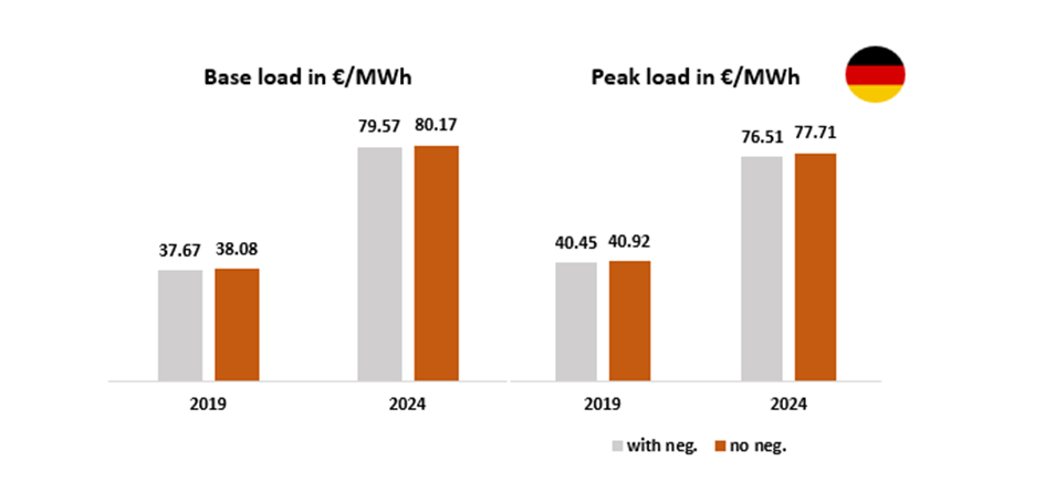 Graph: Comparison of German base- and peak load prices once including negative prices and once with negative prices set to zero. Values for Germany.