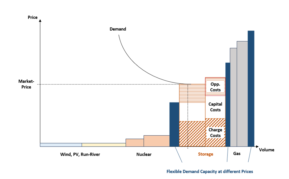 Graph: Merit Order with storage capacity and demand-side flexibility in the supply curve.