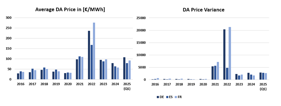 Graph: Yearly average DA prices and yearly variance in France (FR), Spain (ES) and Germany-Luxemburg (DE). For DE prices before October 2018 include the bidding zone Austria.